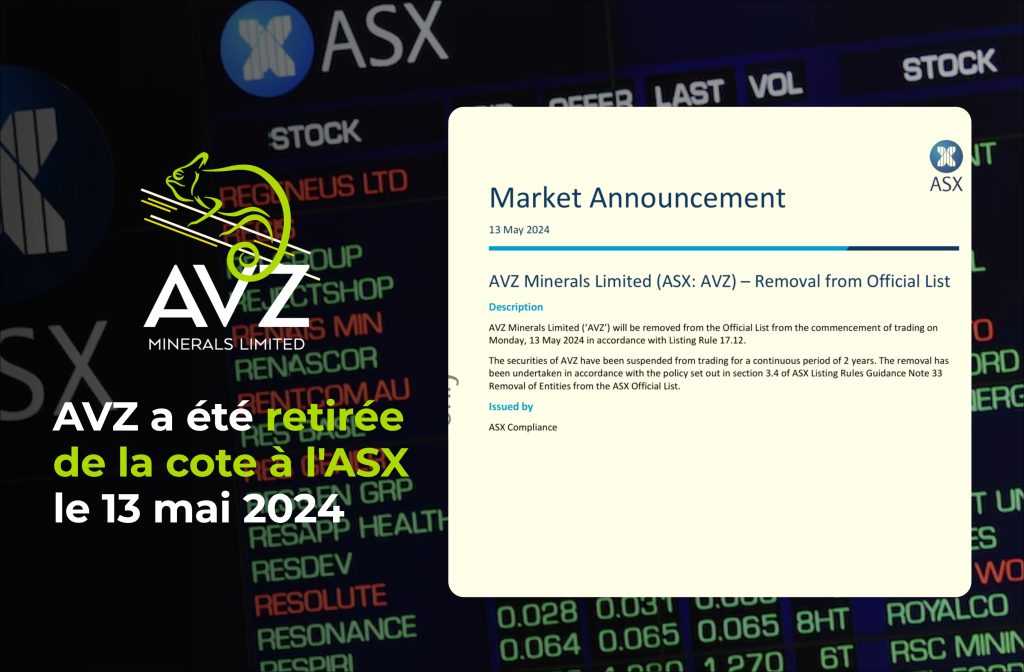 Selon l’annonce publiée par le département de conformité de l’ASX, AVZ a été officiellement retirée de la cote de l’ASX à partir du 13 mai 2024.